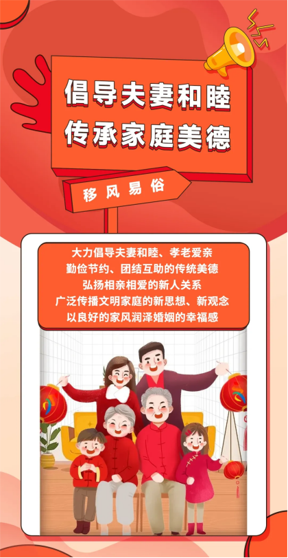 新时代要有新思想,新时代要有新风貌,广大家庭要积极践行社会主义核心价值观,弘扬中华传统美德,积极涵养勤俭节约、邻里友善、团结互助、廉洁齐家等良好家风,用好家风带动好民风、促进好社风,推动形成爱国爱家、相亲相爱、向上向善、共建共享的社会主义家庭文明新风尚,争做新时代文明新风的引领者。