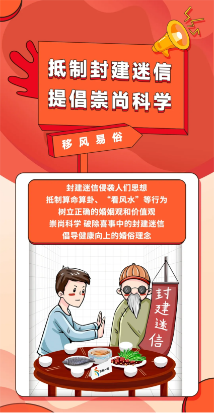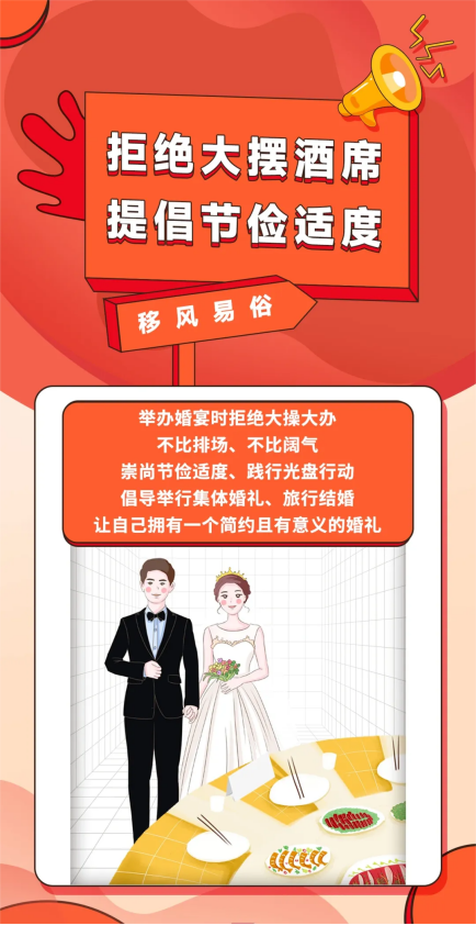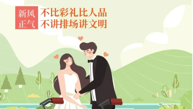 幸福的婚姻是男女青年共同的梦想,美满的家庭是社会和谐的稳定基础。但婚嫁活动中的一些陈规陋习和攀比心理却为本该神圣的婚礼增添了一些不和谐的音符,甚至成为许多年轻人婚姻幸福的阻碍。我们倡导喜事新办的文明新风,抵制高价彩礼,弃除人情攀比、大操大办的婚俗陋习,让婚姻的缔结回归情感。